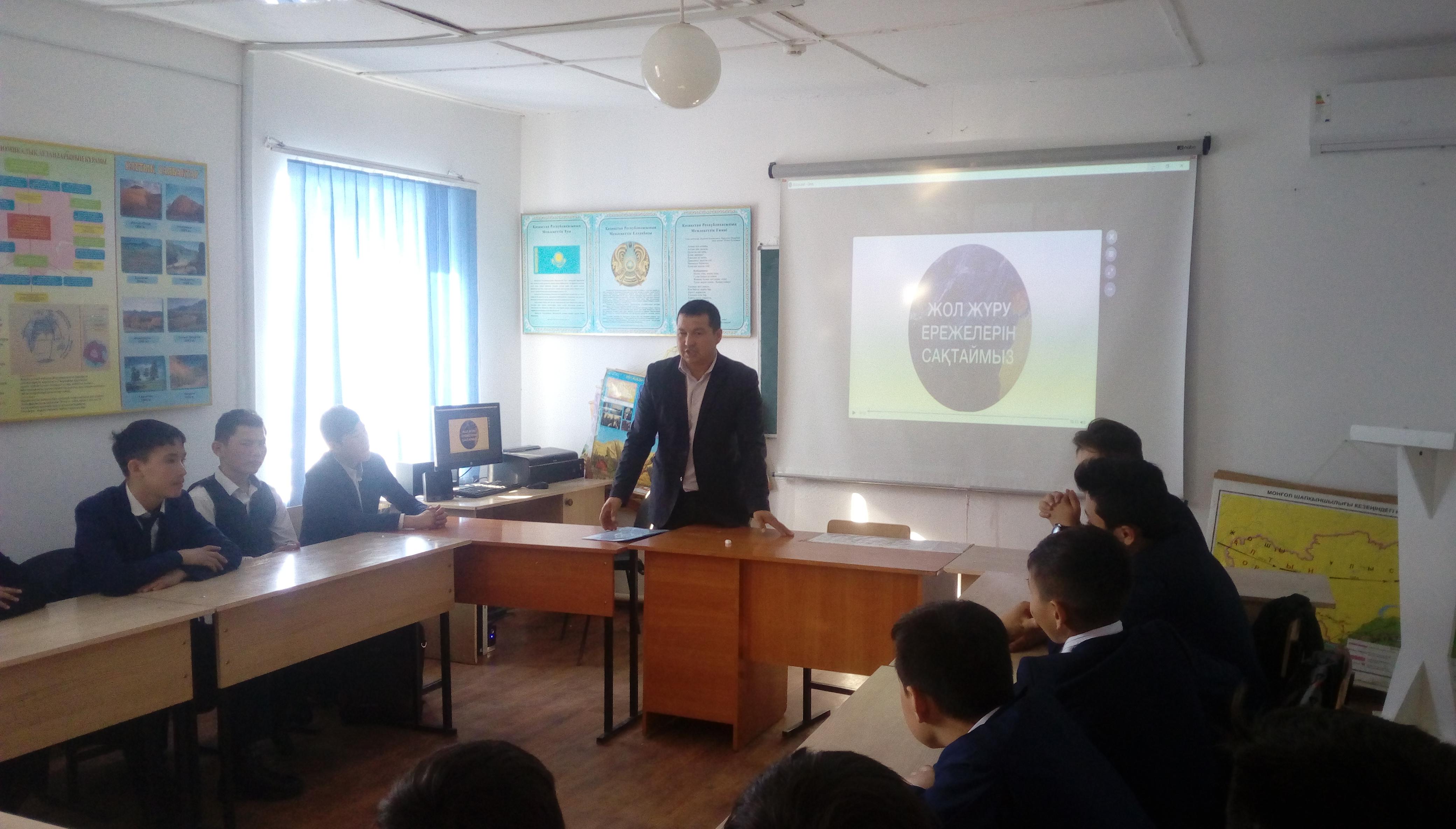 Акция аясында жас полиция көмекшілерімен бірлесіп "Жол қозғалысы ережелерін сақтау" тақырыбында 5-11 сынып оқушыларына кеңес берілді.