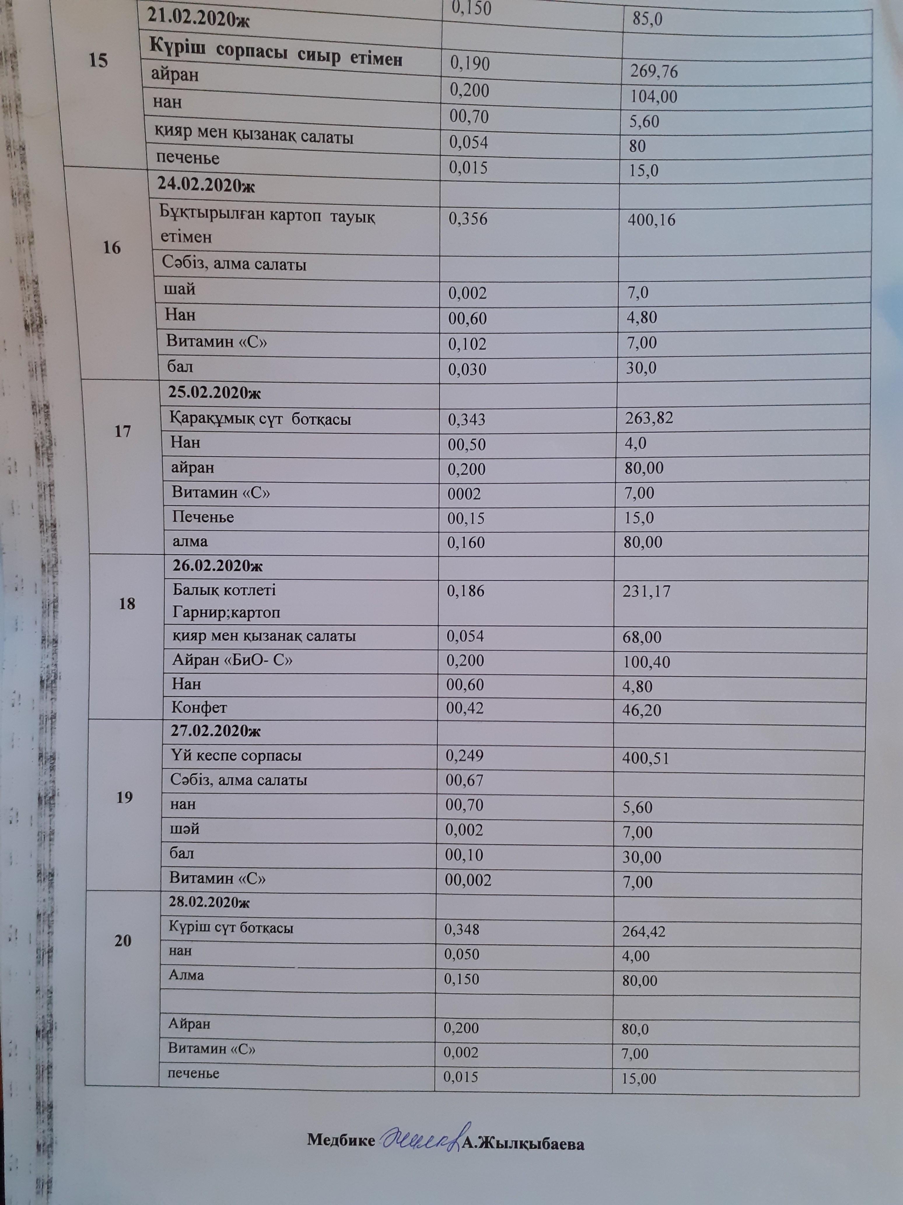 1 сынып оқушыларының 10 күндік ас мәзірі