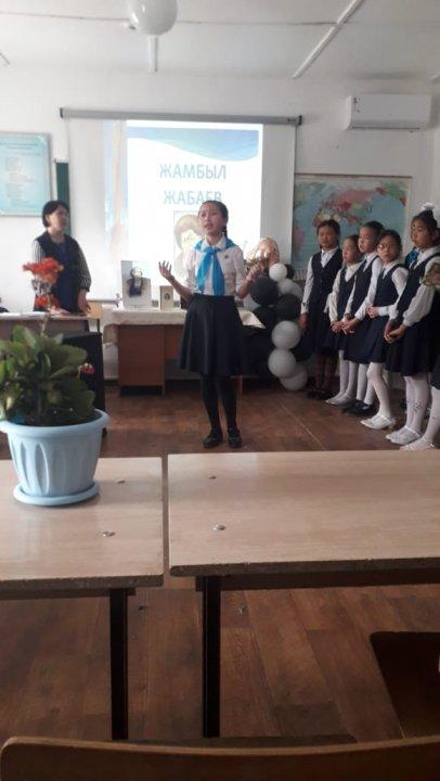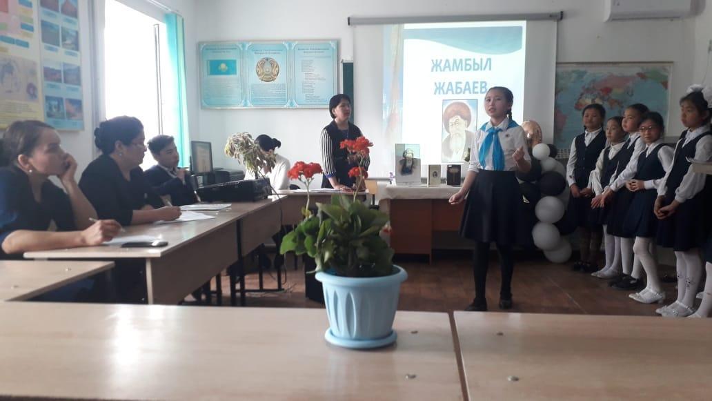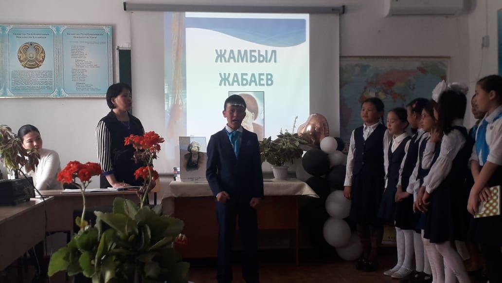 28 ақпан Жамбыл Жабаевтың туған күніне орай "Жыр алыбы Жамбыл"  тақырыбында  мәңерлеп оқу байқауы өтті. Байқау екі бөлім бойынша өтті. Бірінші бөлімінде кітапханашылар Ж.Туралиева мен Г.Алдиярованың ұйымдастыруымен көрме, слайд көрсетіп (мұражайына саяхат, видео роликтер жасатып мағлұматтар берілсе, екінші бөлімде 4-11 сынып аралығында ақын өлеңдерін мәнерлеп жатқа айтудан сайысқа түсті.