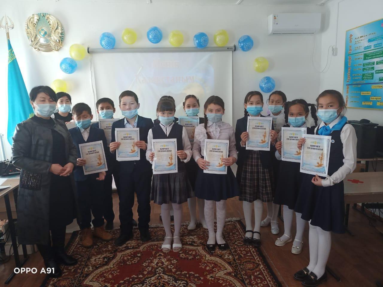 21 январь 2021 0 1 2 3 4 5 "Менің Қазақстаным" №3 орта мектебінде "Жас Ұлан" ұйым мүшелерінің ұйымдастыруымен Тәуелсіздіктің 30 жылдығына орай "Менің Қазақстаным" атты мәнерлеп оқу байқауы өтті.Байқаудан сүрінбей өткен Үшкемпір Ақсезім бас жүлдемен марапатталды.