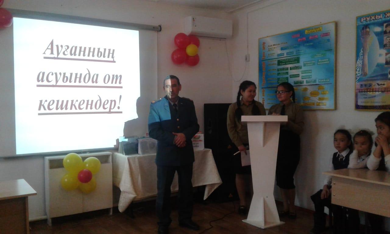 АӘД пән мұғалімі Т.Жұмадиловинтерноцианалист ардагерлердің Ауған соғысында көрсеткен ерлігі мен қайсарлықтарын тарихи деректер бойынша баяндап,мектеп оқушыларын патриоттық рухта өсуге,Отанына деген сүйіспеншілікке ,жеке адамның аман-саулығының қоғамдық мемлекеттік қауіпсіздікке тікелей байланыста екенін сездірді.